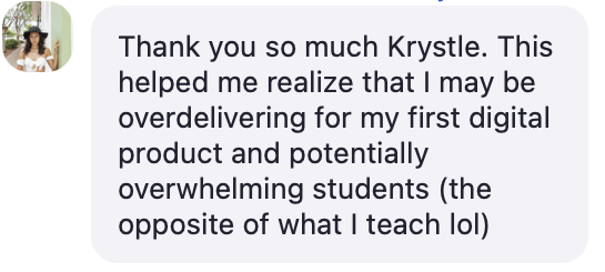 Krystle is not like other people in the online education and coaching space. I never felt like she was checking boxes of a "cookie-cutter method". Everything was tailored to me and as someone who runs a different business than a lot of my competitors, Krystle's ability to offer personalized advice was really important to me.